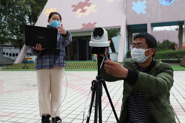 3月10日,在柯橋區(qū)錢清街道南錢清幼兒園門口,中國鐵塔紹興市分公司安裝工程師正在安裝調(diào)試紅外線測溫儀。該測溫儀能夠在多人同時(shí)經(jīng)過時(shí),瞬間發(fā)現(xiàn)體溫異常者并預(yù)警。開學(xué)在即,柯橋區(qū)各學(xué)校統(tǒng)一安裝了紅外線測溫儀,并配備一次性防護(hù)口罩、消毒藥劑等防護(hù)物資。