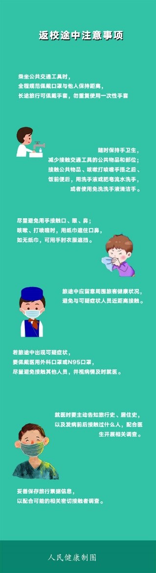近日,多地明確開學(xué)日期。在即將返校的途中,學(xué)生如何做好自身防護、開學(xué)期間如何避免交叉感染,這些都是家庭、學(xué)校乃至全社會關(guān)注的重點。下面,健康小編就向大家介紹一下返校途中以及學(xué)生上課后應(yīng)該注意的事項。