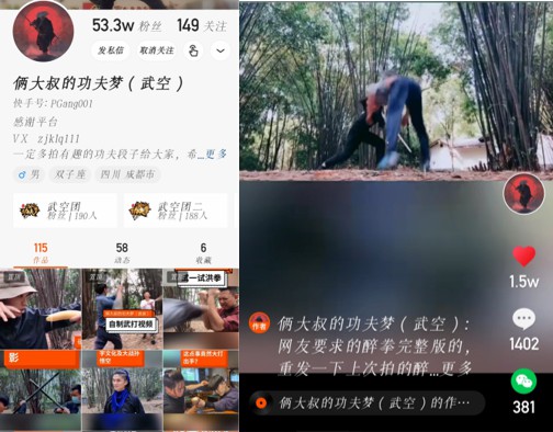 張繼坤在快手上注冊(cè)一個(gè)賬號(hào),名叫“倆大叔的功夫夢(mèng)(武空)(快手號(hào):PGang001),專(zhuān)門(mén)用來(lái)發(fā)布他與師兄弟自拍自導(dǎo)的武打視頻,目前,他已在快手上發(fā)布了116個(gè)視頻,擁有54.1萬(wàn)的粉絲量。張繼坤的視頻里,主要以武打?yàn)橹,猴拳、洪拳、五郎八卦棍各路棍法、拳法?yīng)有盡有。張繼坤的視頻里面偶爾會(huì)穿插一些小劇情,讓視頻顯得豐富生動(dòng)。比如在猴拳的視頻中,化名為硬猴拳文彪的張繼坤與師兄王群一開(kāi)場(chǎng)就是激烈的對(duì)打,打了一分多鐘,在張繼坤即將勝利的時(shí)候,王群突然拿出一根香蕉,原本暴躁的猴子張繼坤突然停下,接過(guò)香蕉吃起來(lái)。這樣突如其來(lái)的轉(zhuǎn)變讓很多網(wǎng)友哭笑不得,“這樣的小包袱嚇我一跳!薄按蚨肥昼姡蝗缫桓憬。”當(dāng)然也有網(wǎng)友只關(guān)注到武打的場(chǎng)面,“我仿佛又看到了十幾年前的武打片,沒(méi)有多余的特效。”“看得我熱血沸騰。”“比絕大部份的電影和電視劇好看!边@個(gè)1分53秒的視頻,播出后獲得了10多萬(wàn)的點(diǎn)贊和500多萬(wàn)的播放量。