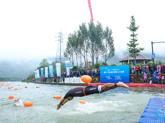 天然水域游泳、公路自行車、公路長(zhǎng)跑構(gòu)成了“鐵三”的比賽項(xiàng)目,按照總用時(shí)角逐勝負(fù)。首先開始游泳比賽,隨著一聲長(zhǎng)笛聲響,參賽選手紛紛躍身入水。大家如魚兒一樣揮動(dòng)著有力的雙臂,撥開碧綠的溪水,飛快地游動(dòng)著,觀戰(zhàn)的游客拉開嗓門為他們加油,現(xiàn)場(chǎng)一片歡騰。