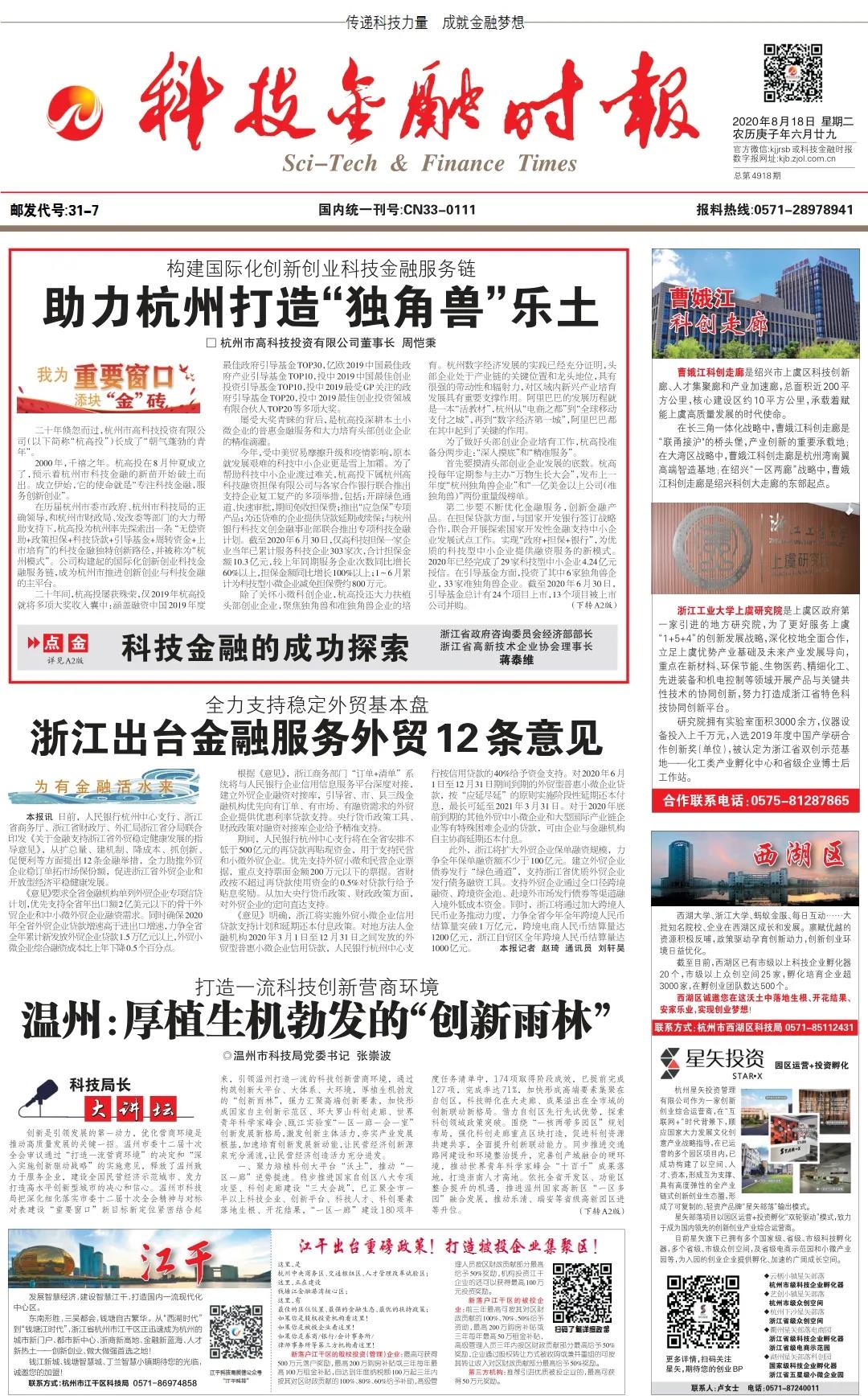 在歷屆杭州市委市政府、杭州市科技局的正確領(lǐng)導(dǎo),和杭州市財(cái)政局、發(fā)改委等部門的大力幫助支持下,杭高投為杭州率先探索出一條?“無償資助+政策擔(dān)保+科技貸款+引導(dǎo)基金+周轉(zhuǎn)資金+上市培育”的科技金融獨(dú)特創(chuàng)新路徑,并被稱為“杭州模式”。公司構(gòu)建起的國(guó)際化創(chuàng)新創(chuàng)業(yè)科技金融服務(wù)鏈,成為杭州市推進(jìn)創(chuàng)新創(chuàng)業(yè)與科技金融的主平臺(tái)。