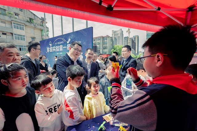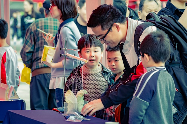 觀展的孩子和家長饒有興趣地參與各個家庭實驗室攤位的科學(xué)演示和互動交流。