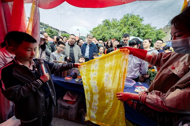 溫州市籀園小學(xué)學(xué)生葉明軒、吳雨軒的植物扎染實驗室,采用紅花、梔子等天然材料進行布料的染色,制作的彩色哈達讓大家非常感興趣。面對博導(dǎo)們的提問,他們對答如流。