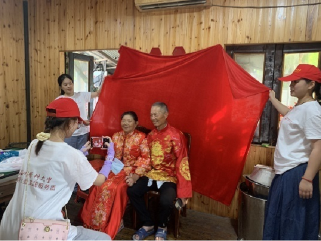 而像這樣的笑臉,溫醫(yī)大“默守夕陽(yáng)”實(shí)踐團(tuán)在活動(dòng)中還收集了很多。以“守護(hù)記憶,關(guān)愛老人精神富!睘橹黝},實(shí)踐團(tuán)在沙河村開展了為老年人拍攝紀(jì)念照的活動(dòng)。除了甜蜜的金婚夫妻,還有拉著老姐妹一同前來的奶奶們、從沒穿過精致婚服想圓夢(mèng)的老人。