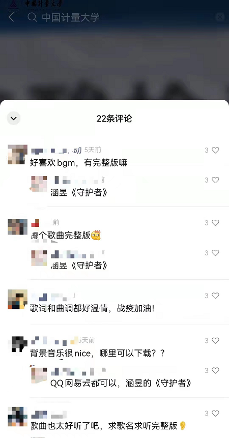 面對當(dāng)下嚴(yán)峻復(fù)雜的疫情防控形勢,為守護(hù)師生健康和校園安全,近期各大高校紛紛開展師生核酸檢測。中國計(jì)量大學(xué)也于日前順利完成了該項(xiàng)工作,對于學(xué)校在拍攝制作開展核酸檢測工作的視頻新聞中選用了這首歌作為背景音樂,而讓這首《守護(hù)者》在量大的校園里迅速走紅,吳涵昱連連表示自己“沒想到”“很意外”。