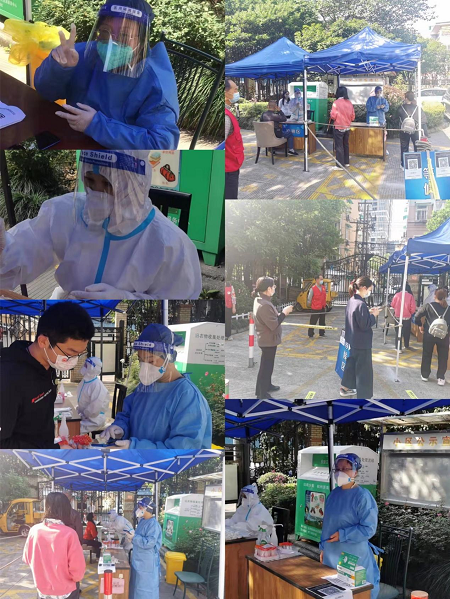 面對突出的供需矛盾,浙江俊騰物業(yè)管理有限公司與“艮山福居”業(yè)委會義不容辭地承擔(dān)了自籌監(jiān)測點的艱巨任務(wù):一面積極派員參加有關(guān)部門組織的檢測培訓(xùn),一面在業(yè)主群緊急動員居民中的黨員、骨干和熱心居民,號召大家行動起來參與小區(qū)抗疫的志愿服務(wù)活動。4月30日試設(shè)點檢測,5月1日開始每天上午8:00-11:30在西門設(shè)點開展常態(tài)化核酸檢測。俊騰物業(yè)主任沈群親自擔(dān)任采樣員和掃碼員。公司唯一的女員工郭美蓉連續(xù)幾天都忙碌在采樣員的崗位上,顧不上喝口水或上廁所。業(yè)委會陳主任一邊在單位上班,一邊仍堅持帶領(lǐng)業(yè)委會班子成員每天到檢測點輪值服務(wù)。