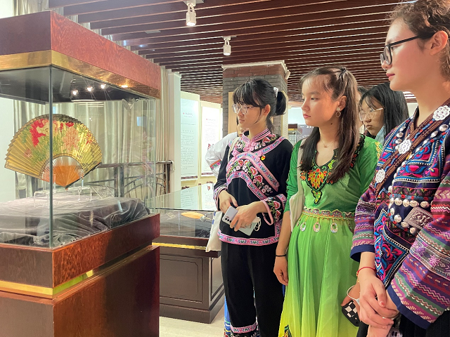 王星記作為一家百年老字號(hào)扇子生產(chǎn)廠家,是我國制扇業(yè)中產(chǎn)量最大,花色品種最多的一家綜合性扇廠。在同學(xué)們與浙江省工藝美術(shù)大師俞備紅交流中,畬族同學(xué)鐘奕的服飾引起了她的注意。“我扇子上的圖案取材于浙江,我覺得也可以取他們民族服飾的圖案,與扇子相結(jié)合,共同傳播畬族文化!”俞備紅聽完鐘奕同學(xué)對(duì)畬族服飾介紹后說。