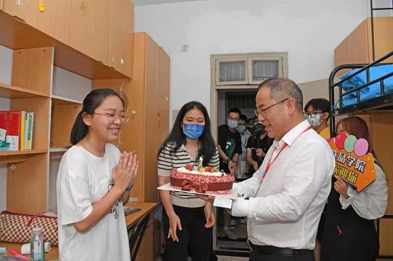 “大學(xué)報到第一天,剛好趕上自己過生日,第一次離開父母過生日還真不習(xí)慣,也不知道該準備什么。光顧著準備開學(xué)的東西,都忘了生日可以吃蛋糕。”食品與生物工程學(xué)院新生明靜來自海寧,收到蛋糕的時候非常激動,“學(xué)校居然記得我的生日,書記還給我題字,開啟我大學(xué)生活的序幕,這太讓我驚喜了!”