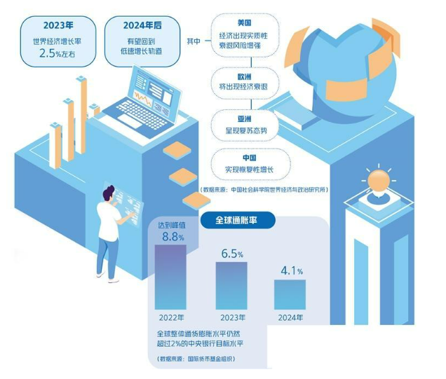 根據(jù)中國社會(huì)科學(xué)院世界經(jīng)濟(jì)與政治研究所的測(cè)算,2023年世界經(jīng)濟(jì)增長率為2.5%左右。2024年后,全球經(jīng)濟(jì)有望回到低速增長的軌道。