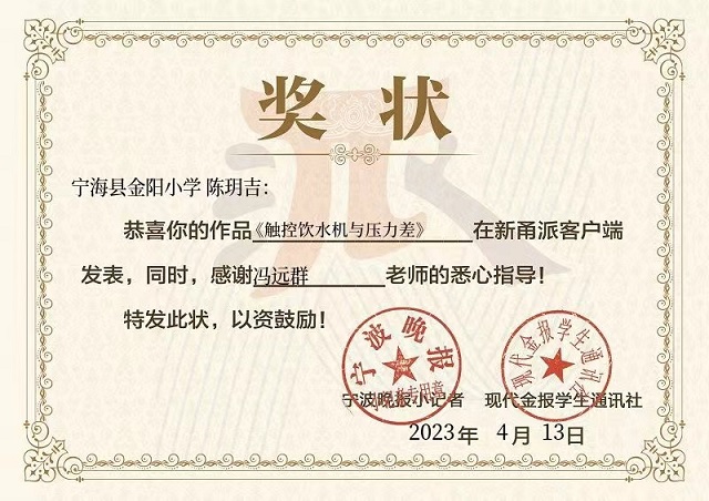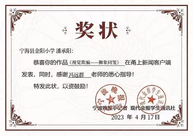 日前,寧?h金陽小學陳玥吉同學的《觸控飲水機與壓力差》與潘承陽同學的《視覺欺騙——獅象同籠》先后被新甬派客戶端刊發(fā),并各自收到了《寧波晚報》《現(xiàn)代金報學生通訊社》聯(lián)署的獎狀,為金陽小學科普教育再添喜報。