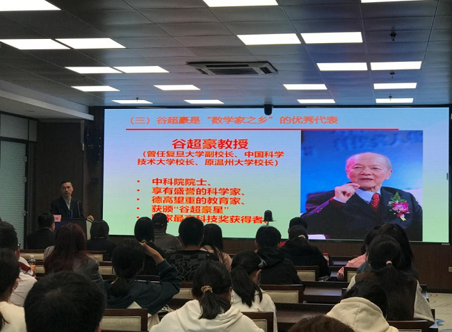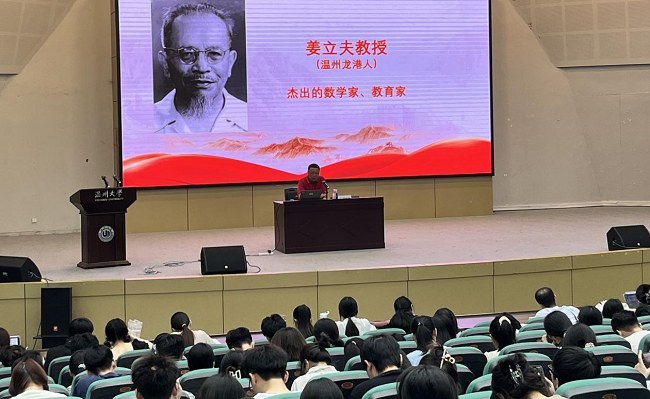 “姜立夫先生是中國現(xiàn)代數(shù)學(xué)的奠基人,早年他在美國加州大學(xué)學(xué)習(xí)時(shí),就立志要把現(xiàn)代數(shù)學(xué)移植到中國來,他的一生對中國數(shù)學(xué)作出了巨大貢獻(xiàn)……”5月29日晚,在一場主題為弘揚(yáng)科學(xué)家精神的專題講座上,溫州大學(xué)數(shù)學(xué)系主任郭洪欣教授如數(shù)家珍般介紹姜立夫先生的故事,向溫大學(xué)子傳播科學(xué)的種子。