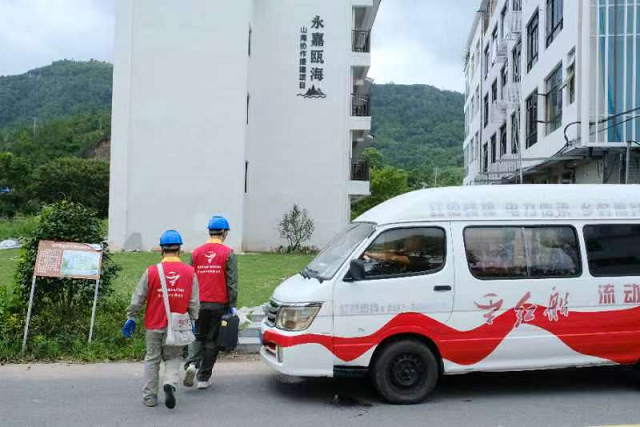 7月29日,國網(wǎng)永嘉縣供電公司紅船·流動(dòng)電力驛站繞著山路前往鑊爐村、西爐村等地6個(gè)緊急避災(zāi)點(diǎn)進(jìn)行用電檢查,為轉(zhuǎn)移安置人員編織防汛防臺(tái)安全網(wǎng)。