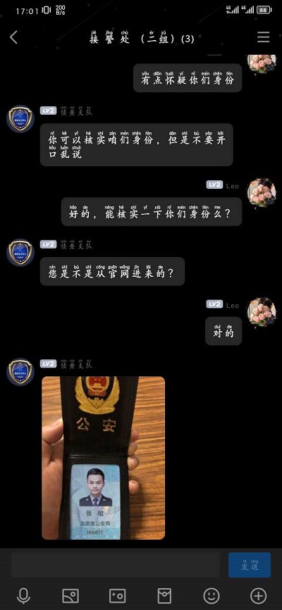 民警假裝自己受騙,對方要求提供信息進行網(wǎng)上立案,信息中除了姓名、身份證號、被騙時間、數(shù)額、原因及聯(lián)系電話等正常信息外,居然還要求提供QQ賬號。果不其然,沒多久,對方發(fā)來一個名為“專案網(wǎng)警警官”的QQ群號”讓民警添加后進行處理。當民警質疑對方身份真實性,對方立即將一張警官證發(fā)了過來,當民警提出視頻核實時,遭到對方拒絕,并將其拉黑。