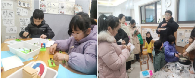 活動(dòng)前期,各班教師根據(jù)幼兒年齡特點(diǎn),結(jié)合幼兒興趣、生活經(jīng)驗(yàn)、主題活動(dòng),有效地利用空間,為幼兒創(chuàng)設(shè)出一個(gè)個(gè)富有童趣、寓教于樂(lè)的自主科學(xué)區(qū)域活動(dòng)環(huán)境。分享教師就班級(jí)科學(xué)區(qū)的創(chuàng)設(shè)思路、材料投放策略、材料的具體玩法、幼兒自主探索活動(dòng)、生成游戲等情況尤如一場(chǎng)場(chǎng)移動(dòng)的大講堂與大家進(jìn)行詳細(xì)的介紹與分享。