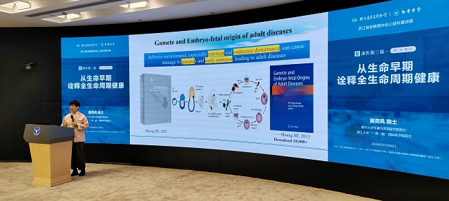 中國(guó)科學(xué)院院士、復(fù)旦大學(xué)生殖與發(fā)育研究院院長(zhǎng)、浙江大學(xué)“一帶一路”國(guó)際醫(yī)學(xué)院院長(zhǎng)黃荷鳳作了《從生命早期詮釋全生命周期健康》科普?qǐng)?bào)告。杭州市西湖區(qū)三墩鎮(zhèn)水秀苑社區(qū)黨總支書(shū)記梁小平組織社區(qū)居民走進(jìn)浙江大學(xué)紫金港校區(qū)智云報(bào)告廳,面對(duì)面聆聽(tīng)黃院士講課。