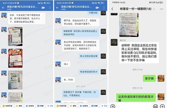 “你好,今天收到兩個奇怪的快遞,是不是詐騙的。恳蔡珖樔肆,家里地址都這么清楚。”1月18日16時22分,杭州市蕭山區(qū)蜀山派出所駐村輔警在企業(yè)微信上收到北辰奧園租戶的詢問,疑似有被騙風(fēng)險。駐村輔警了解情況后立即告知該業(yè)主不要繼續(xù)進(jìn)行操作,同時與社區(qū)民警確認(rèn)是詐騙后,第一時間上門拆除該“詐彈”。