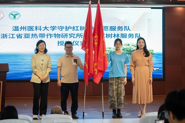 浙江省亞熱帶作物研究所所長陳秋夏所長和溫州醫(yī)科大學檢驗醫(yī)學院(生命科學學院)黨委書書洪曉暢分別給兩家單位的紅樹林守護志愿服務隊授旗,授予小學生們紅樹林騎士稱號證書,希望他們進一步弘揚“奉獻、有愛、互助、進步”的志愿精神。