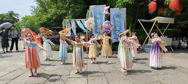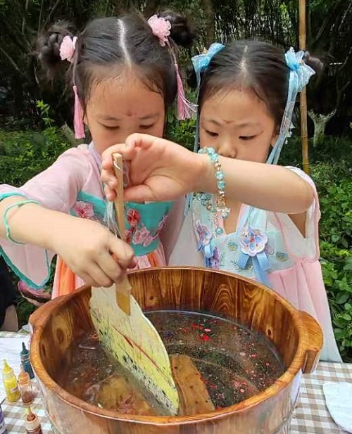 據(jù)了解,大華西溪風(fēng)情幼兒園大班組非遺民俗課程已有相當(dāng)深厚的基礎(chǔ),教師緊扣傳統(tǒng)文化特色,從孩子們的興趣出發(fā),在環(huán)境氛圍提升、民俗主題活動(dòng)設(shè)計(jì)、傳統(tǒng)文化學(xué)習(xí)、傳統(tǒng)游戲空間打造等方面大膽嘗試、積極努力。前期在園內(nèi)進(jìn)行了口脂、花鈿、發(fā)釵、手繩、漢服、鳳仙花染甲等系列傳統(tǒng)文化課程探索,在孩子們心中種下傳統(tǒng)文化的種子。