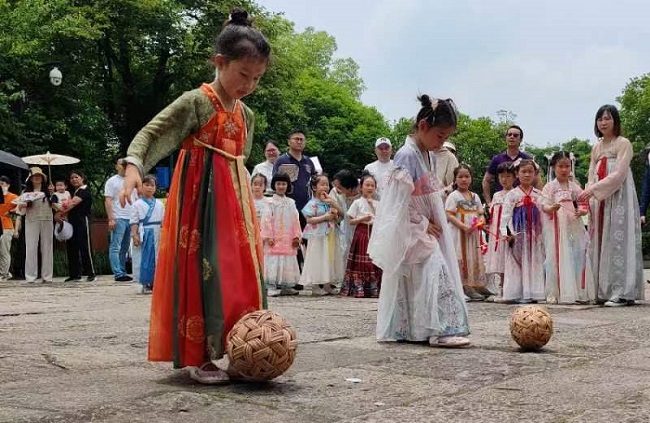 瞄準(zhǔn),投擲,中啦!孩子們興奮地歡呼著,他們身著漢服,正興致勃勃地玩著投壺游戲。5月19日是中國(guó)旅游日。在杭州西溪濕地國(guó)家公園,以“傳世宋韻·浙江有禮”為主題的杭州市余杭區(qū)大華西溪風(fēng)情幼兒園“國(guó)風(fēng)雅韻·禮潤(rùn)童心”非遺展演活動(dòng)正在舉行。
