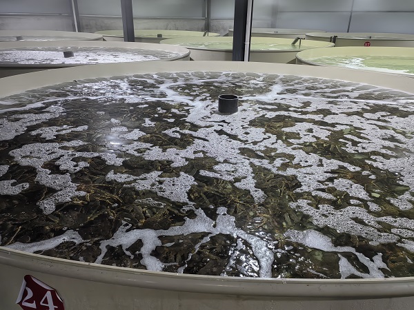 即使是夏天,一走進養(yǎng)殖基地,也不由讓人倒吸一口冷氣。在現(xiàn)場,記者注意到車間內(nèi)的水質(zhì)在線監(jiān)測系統(tǒng),包括溶氧、水溫、pH值、鹽度等關鍵指標實時顯示著,其中,水溫一欄顯示的溫度在3.9°C到4.1°C之間!暗弁跣分悄芄S化暫養(yǎng)技術在舟山市‘揭榜掛帥’科技攻關項目支持下,開展了帝王蟹工廠化循環(huán)水暫養(yǎng)環(huán)境快速精準感知技術研究和智能化養(yǎng)殖系統(tǒng)集成,構(gòu)建了包括海水制冷系統(tǒng)、循環(huán)水處理系統(tǒng)、增氧系統(tǒng)、水質(zhì)在線監(jiān)測等帝王蟹智能工廠化循環(huán)水養(yǎng)殖系統(tǒng),高度仿生帝王蟹的原產(chǎn)地環(huán)境,打造帝王蟹最佳生存環(huán)境!毙そ鹦墙榻B,帝王蟹暫養(yǎng)期間,他們還做到了讓帝王蟹不減重。
