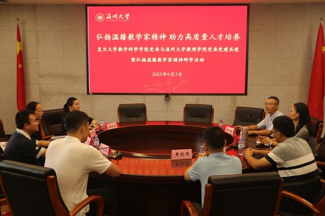 9月3日,溫州大學(xué)數(shù)理學(xué)院黨委與復(fù)旦大學(xué)數(shù)學(xué)科學(xué)學(xué)院黨委在溫州大學(xué)南校區(qū)巖松堂聯(lián)合開(kāi)展黨建共建活動(dòng);顒(dòng)以“弘揚(yáng)溫籍?dāng)?shù)學(xué)家精神、助力高質(zhì)量人才培養(yǎng)”為主題,通過(guò)實(shí)地參觀、紀(jì)念館研學(xué)與主題座談等形式,深度促進(jìn)兩院黨建與業(yè)務(wù)融合,共同探索科學(xué)家精神育人新路徑。
