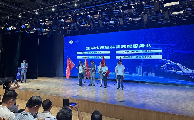 金華市科協(xié)黨組書記、主席施怡偉為社區(qū)應急科普志愿服務隊、農(nóng)村應急科普志愿服務隊、校園應急科普志愿服務隊、企業(yè)應急科普志愿服務隊等4支應急科普志愿服務隊授旗。