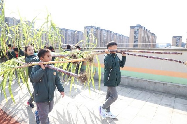 “本草園”是筧弘實(shí)驗(yàn)學(xué)校依托樓頂空間打造的特色勞動(dòng)教育基地,自學(xué)校成立以來,便成為師生共同耕耘的“空中田園”。從翻土、播種到澆水、施肥,五年級(jí)的同學(xué)們以班級(jí)為單位,定期輪值照料這片“責(zé)任田”。此次豐收的甘蔗,正是同學(xué)們親手栽種的成果——當(dāng)時(shí)他們小心翼翼地將蔗苗埋進(jìn)土里,如今看著一人多高、葉片翠綠的甘蔗林,眼中滿是期待與自豪。