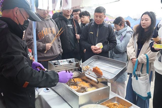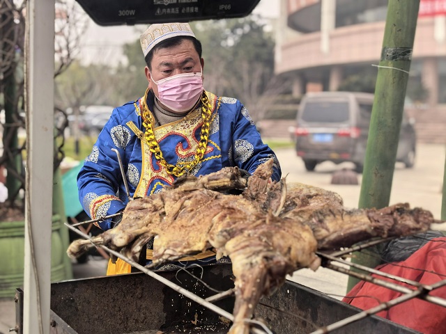 走進市集,濃郁年味撲面而來。奶皮子糖葫蘆、潮汕牛肉丸、長沙臭豆腐、烤全羊等20余種現(xiàn)制各地美食和14個特色檔口,吸引不少師生駐足品嘗,師生們邊逛邊吃,一站式打卡各地美味!斑@是我們家鄉(xiāng)的泡蝦,味道特別贊!你們也嘗嘗!眮碜耘_州的王意霞向朋友推薦起了家鄉(xiāng)美食。