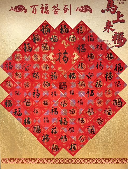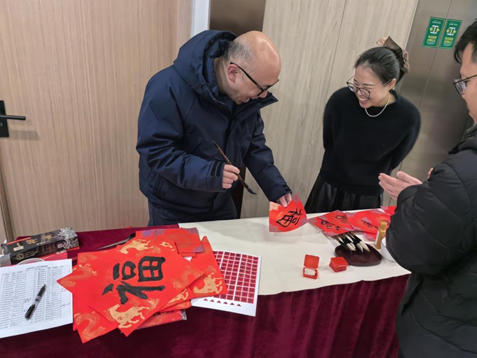 活動現場,“百福簽到”墻亮眼吸睛,“馬上來福”的主題傳遞著新春祝福。開筆納福環(huán)節(jié),書法愛好者們揮毫潑墨、筆走龍蛇,紅紙鋪展間,一個個蒼勁有力、圓潤飽滿的“!弊周S然紙上。員工們或駐足觀摩,或親手執(zhí)筆,將對新年的美好期許融入筆墨,把平安順遂的祝福凝于紙上,并親手貼在百福墻上。一幅幅手寫福字,傳遞著平安人對新一年的憧憬。