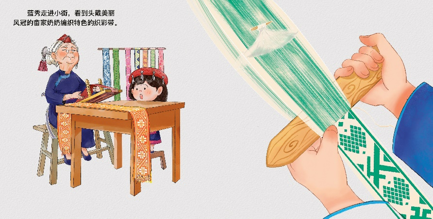 為了打破傳統(tǒng)繪本的靜態(tài)邊界,創(chuàng)作團(tuán)隊將手繪藝術(shù)與前沿數(shù)字技術(shù)深度融合。他們先用Procreate軟件進(jìn)行手繪,嚴(yán)格遵循畬族傳統(tǒng)美學(xué),以青、藍(lán)、紅、白四色為基調(diào):淡墨綠詮釋畬鄉(xiāng)山林,靛染藍(lán)彰顯民族工藝,朱紅與明黃撞色烘托節(jié)慶氛圍,水彩白勾勒山居生活。每一個角色的設(shè)計也頗具匠心,主人公藍(lán)秀活潑好奇,易于引發(fā)年輕讀者共鳴;而織彩帶的阿婆、遞茶的畬鄉(xiāng)孩童等配角,其服飾與造型均嚴(yán)格考證,讓民族特色躍然屏上。