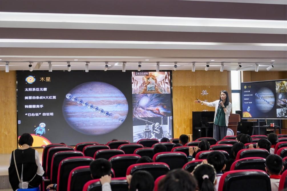 講座現(xiàn)場(chǎng),孫希嵐老師用生動(dòng)有趣的語(yǔ)言和震撼的星空影像,帶領(lǐng)孩子們從熟悉的太陽(yáng)系出發(fā),遨游至遙遠(yuǎn)的星系。從八大行星的獨(dú)特風(fēng)貌,到絢麗的星系星云,復(fù)雜的宇宙知識(shí)化作了孩子們眼中閃爍的好奇光芒。孫老師鼓勵(lì)孩子們:“希望這次講座能在你們心中種下一顆科學(xué)的種子,讓你們?cè)谖磥?lái)的學(xué)習(xí)生活中,能時(shí)常抬頭,愉快地和夜空中熟悉的星星‘打招呼’。”
